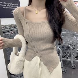 [BC760]더블유 언발 사선버튼 골지 니트 티셔츠